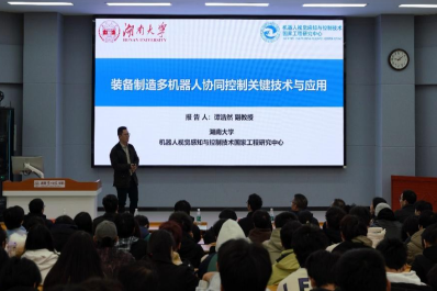 随后的专家讲座中,湖南省杰青、潇湘实验室副主任、湖南大学谭浩然副教授以“装备制造多机器人协同控制关键技术与应用”为主题,分享了机器人视觉感知与控制技术国家工程研究中心在多机器人协同辅助国产大飞机制造方面的前沿成果,并从研究生选拔的角度鼓励同学们注重实践能力的培养。